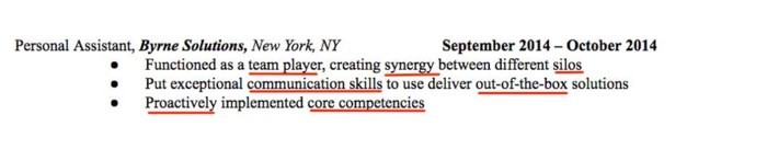 Các thuật ngữ riêng của lý lịch công việc như "tư duy ngoài khuôn khổ", "kỹ năng làm việc nhóm tốt" và "khả năng giao tiếp tốt" là "những từ khá cơ bản trong thị trường việc làm hiện nay", Nicolai nói. "Nhưng một người thực sự ‘làm việc tốt trong nhóm, giải quyết được vấn đề' sẽ biết cách truyền tải điều này một cách súc tích và sáng tạo trên lý lịch của họ thông qua sự kết hợp của ít từ ngữ và hình ảnh minh họa".