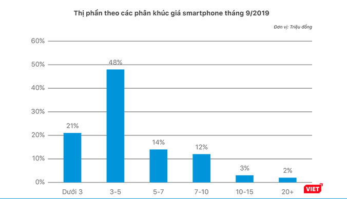 Với mức thu nhập bình quân tại Việt Nam chưa cao, đa phần là tầng lớp thu nhập trung bình và thấp nên các sản phẩm smartphone có mức giá “vừa phải” sẽ dễ dàng chiếm được thị trường. Cũng theo báo cáo, phân khúc giá rẻ và tầm trung từ 3-10 triệu đồng là phân khúc có số lượng thiết bị được bán ra cao nhất, Samsung và Oppo là hai thương hiệu lần lượt chiếm phần lớn thị phần điện thoại chính hãng.