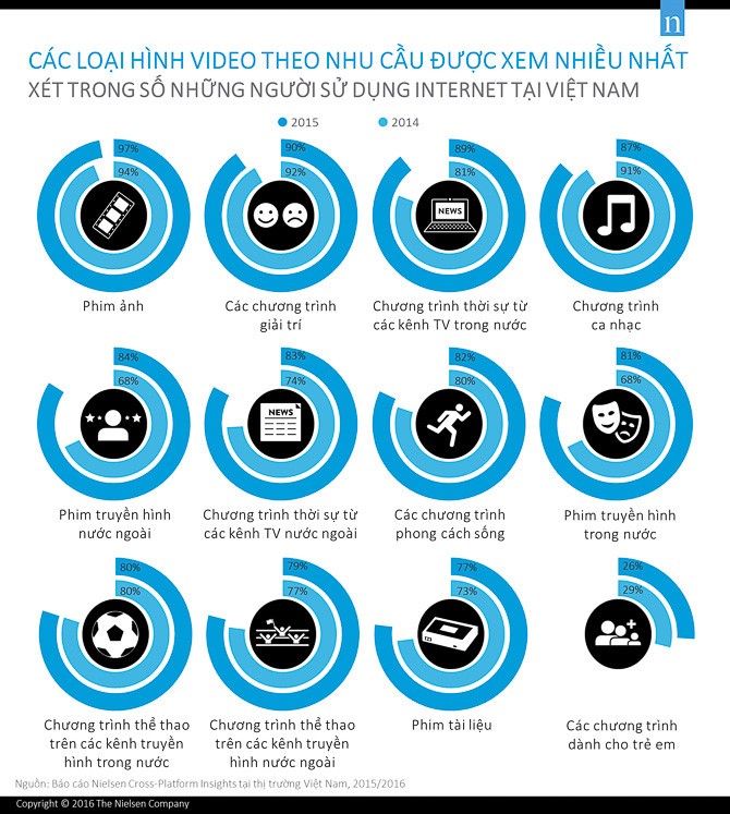Đồng thời, tỉ lệ xem video mỗi ngày cũng có sự gia tăng đáng kể qua từng năm. Trong 4 năm vừa qua, tỉ lệ xem video trực tuyến mỗi ngày đã tăng từ 10% lên đến 64% trong số những người sử dụng Internet tại Việt Nam.