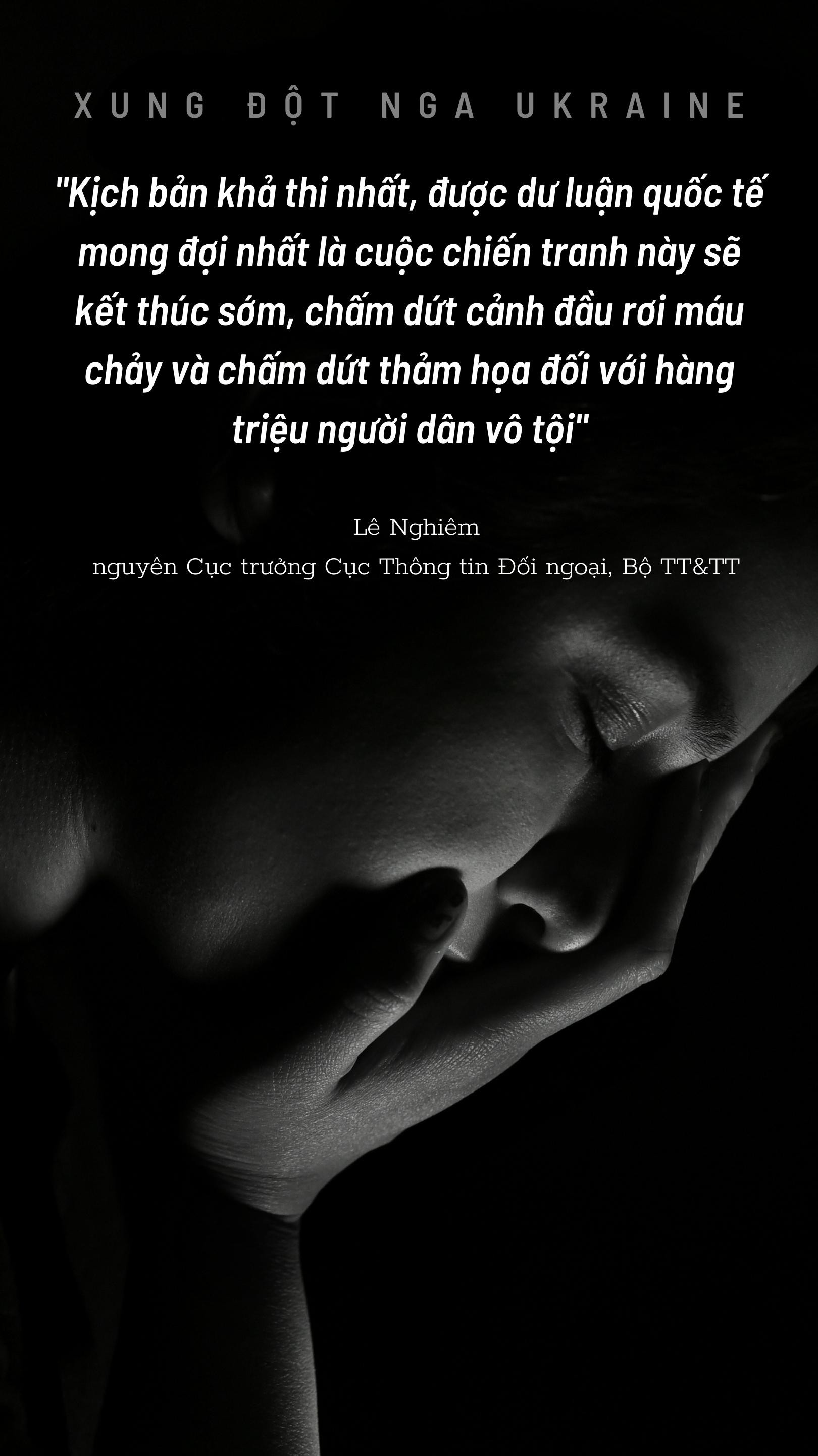 Ông Lê Nghiêm: Kịch bản khả thi nhất, được dư luận quốc tế mong đợi nhất là cuộc chiến tranh này sẽ kết thúc sớm, chấm dứt cảnh đầu rơi máu chảy và chấm dứt thảm họa đối với hàng triệu người dân vô tội. Hai bên ngừng bắn, giải quyết các vấn đề tranh chấp bằng con đường ngoại giao, với sự trung gian, hòa giải của các nước lớn và các nước ở khu vực.