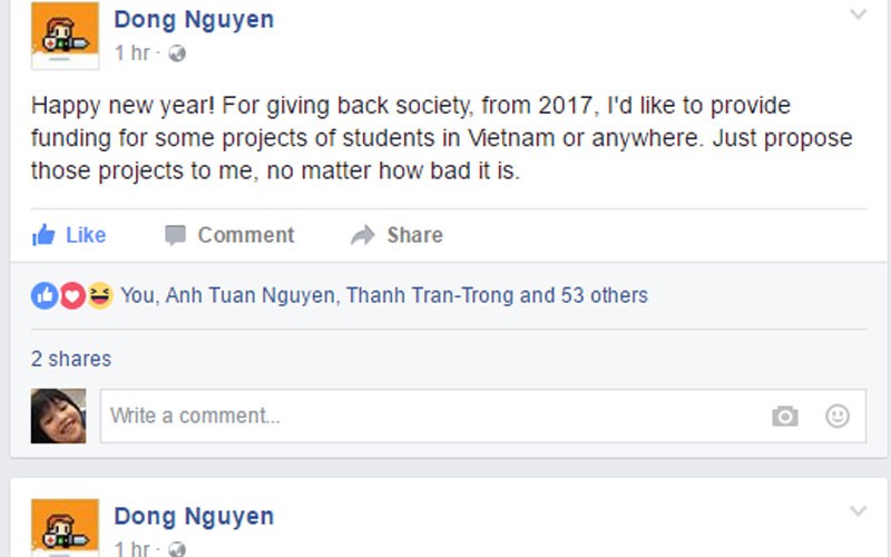 Chiều 2/1/2017, chia sẻ trên trang cá nhân, Nguyễn Hà Đông - tác giả của trò chơi Flappy Bird - cho biết: "Để đóng góp lại cho cộng đồng, từ năm 2017, tôi mong muốn hỗ trợ tài chính cho các dự án của sinh viên tại Việt Nam và ở cả các nước khác. Các bạn sinh viên hãy gửi dự án cho tôi dù nó tệ như thế nào".