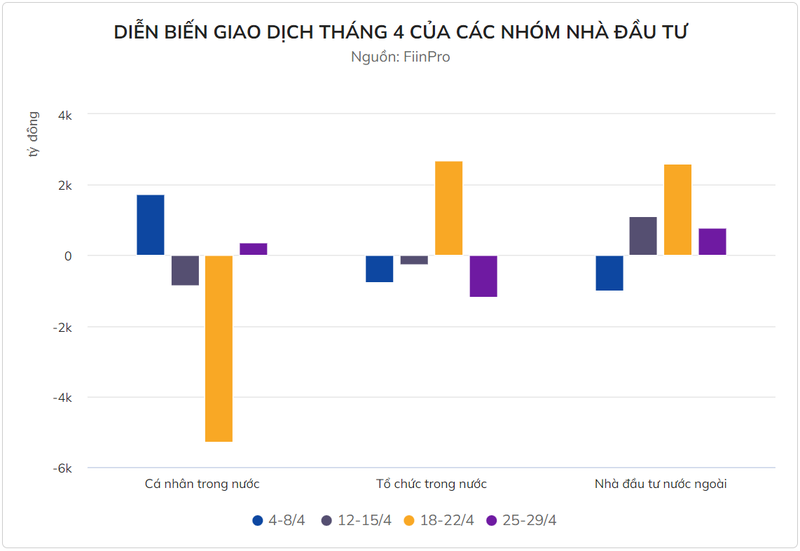 Như vậy, tính trong tháng 4, nhà đầu tư cá nhân trong nước đã bán ròng 4.010 tỷ đồng trên HoSE, trong đó, giao dịch bán tập trung mạnh nhất trong tuần 18-22/4, thời điểm VN-Index giảm mạnh.