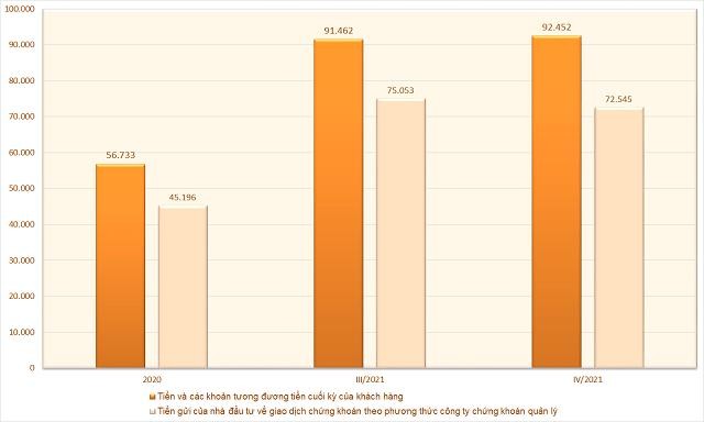 Trong số này đa phần là tiền gửi của nhà đầu tư về giao dịch chứng khoán theo phương thức công ty chứng khoán quản lý với hơn 72.545 tỷ đồng (chiếm 78%), giảm 3,3% so với quý III nhưng vẫn tăng đến 60,5% so với cuối năm 2020.