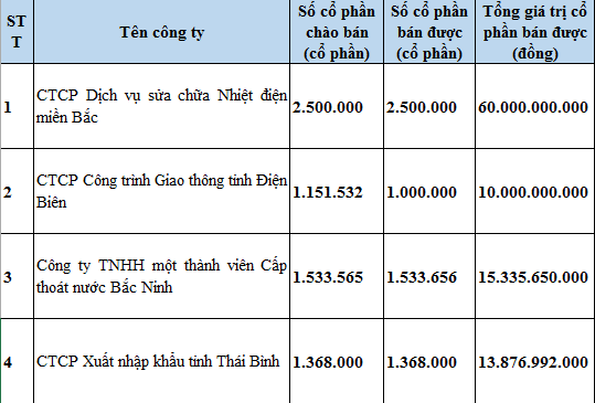 Trong 4 phiên đấu giá này, có một 1 phiên đấu giá lần đầu của Công ty TNHH Cấp thoát nước Bắc Ninh, và 3 phiên đấu giá thoái vốn của CTCP Nhiệt điện Phả Lại, UBND tỉnh Điện Biên, UBND tỉnh Thái Bình lần lượt tại CTCP Dịch vụ Sửa chữa Nhiệt điện Miền Bắc, CTCP Công trình Giao thông tỉnh Điện Biên, CTCP XNK Thái Bình.