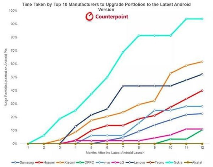 Cụ thể, Counterpoint Research cho biết 96% điện thoại Nokia bán ra kể từ thời điểm Google tung ra Android Pie được đã cài sẵn phiên bản mới nhất của hệ điều hành này hoặc đã nhận được các bản cập nhật mới. Samsung, Xiaomi và Huawei chiếm tỷ lệ khoảng 80%, khoảng cách khá xa so với những gì Nokia làm được. Lenovo và OPPO có con số dưới 50% còn LG, vivo và một số hãng khác có kết quả dưới 20%.