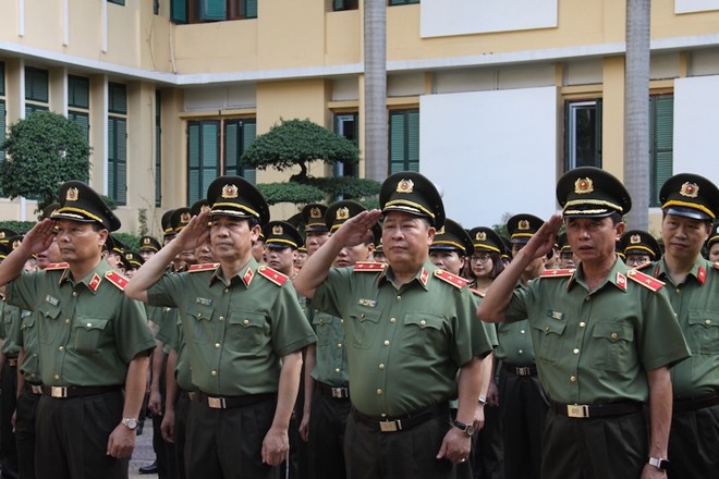 Thứ trưởng Nguyễn Văn Thành và cán bộ chiến sĩ trụ sở cơ quan Bộ Công an thực hiện nghi lễ chào cờ đầu tháng 6 trong trang phục mới
