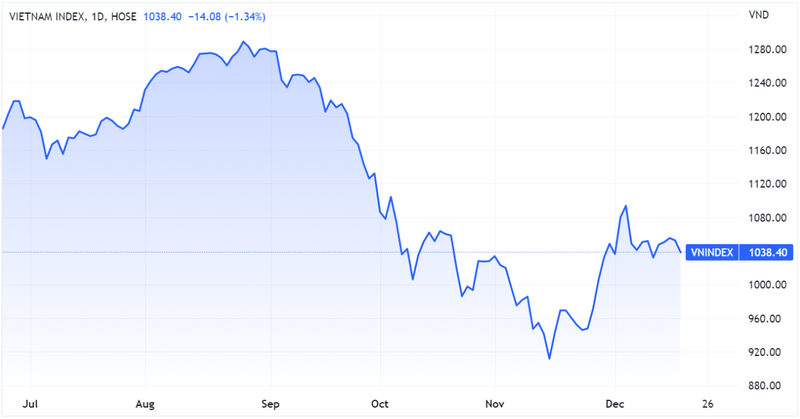 Kết phiên giao dịch ngày 19/12, VN-Index giảm 14,08 điểm (-1,34%) xuống 1.038,4 điểm. Thanh khoản trên sàn HOSE tăng nhẹ 3% so với phiên trước, với giá trị giao dịch đạt 16.042 tỉ đồng, trong đó giá trị giao dịch khớp lệnh đạt 14.241 tỉ đồng.