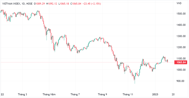 Mặc dù chỉ số vẫn giữ được vùng cân bằng đi ngang tích lũy trong suốt tháng 12 năm ngoái ở quanh mốc 1.065 điểm, nhưng với đà giảm hiện tại, TVSI cho rằng mốc hỗ trợ này khả năng cao sẽ sớm bị xuyên thủng.
