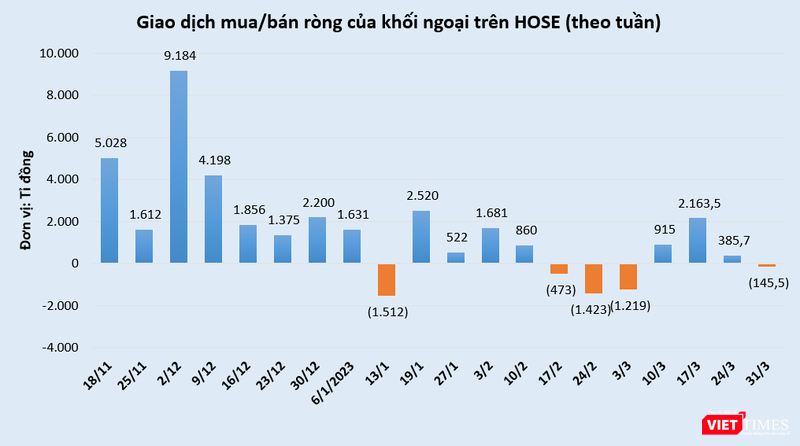 Khối ngoại chuyển bán ròng 145,5 tỉ đồng trên HOSE trong tuần 27-31/3. Tuy nhiên, lũy kế tháng 3/2023, khối ngoại vẫn mua ròng tới 2.759 tỉ đồng, trong khi nhà đầu tư cá nhân bán ròng 948 tỉ đồng.