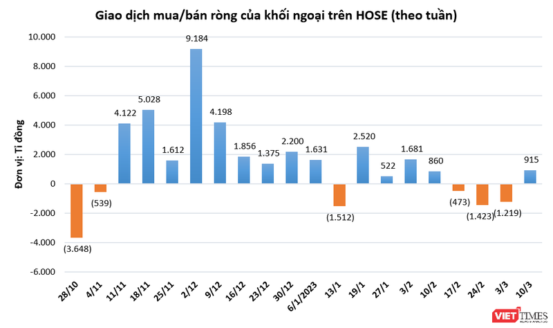 Kết thúc tuần giao dịch 6-10/3, VN-Index tăng 28,23 điểm (+2,75%) lên 1.053 điểm. Thanh khoản trên sàn HOSE cũng được cải thiện với giá trị giao dịch trung bình một phiên đạt hơn 8.600 tỉ đồng, tăng 14,4% so với tuần trước đó.