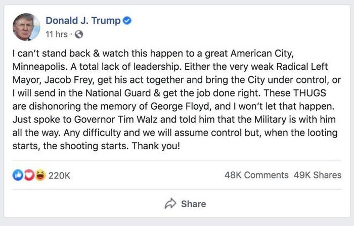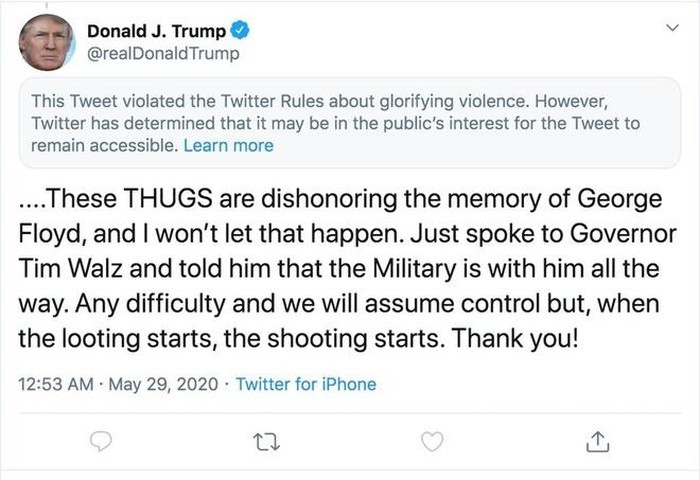 Cụ thể, ông Trump đã có phát ngôn liên quan đến nhóm biểu tình và bạo loạn sau vụ một người da đen bị cảnh sát ghì cổ đến chết. Bài đăng của tổng thống chứa những lời đe dọa như "When the looting starts, the shooting starts" (Khi cướp bóc xảy ra, tiếng súng sẽ nổ).
