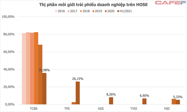 TCBS cũng từng có thời gian chiếm thị phần áp đảo trong mảng trái phiếu niêm yết trên HOSE với hơn 80% từ trước năm 2019, tuy nhiên vị thế đang giảm dần trong 2 năm trở lại đây. Năm 2020, thị phần của TCBS còn 68%. Trong nửa đầu năm 2021, thị phần tiếp tục giảm còn 46%. Chứng khoán TPS vươn lên tương đối mạnh mẽ, nắm 19%.