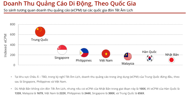 Doanh thu từ quảng cáo trên ứng dụng di động tại Việt Nam chỉ đứng thứ 4 trong nhóm các nước đón Tết theo lịch Âm, đứng sau Trung Quốc, Singapore và Philippines.