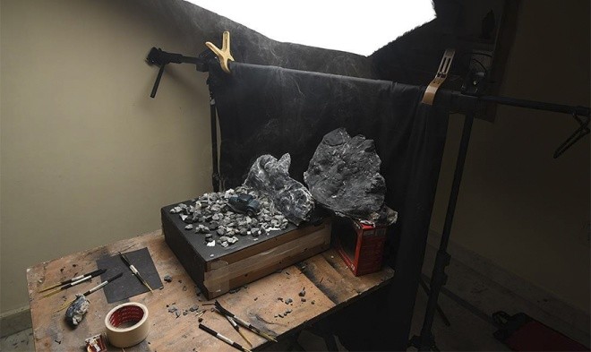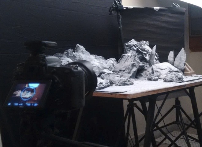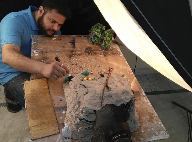 Kataria dùng những thứ có sẵn như đất, đá, vôi vữa và giấy để tạo hình đồi núi.
