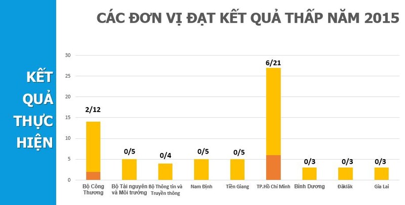 Trong khi đó, những đơn vị "đội sổ" trong công tác này là Bộ Công Thương (2/12 DN), TPHCM (6/21 DN). Thậm chí, có những đơn vị không cổ phần hóa được DNNN nào như Bộ Tài nguyên - Môi trường (0/5), Bộ Thông tin và Truyền thông (0/4 DN), Nam Định, Tiền Giang (0/5 DN); Bình Dương, Đăk Lăk, Gia Lai đều 0/3 DN.