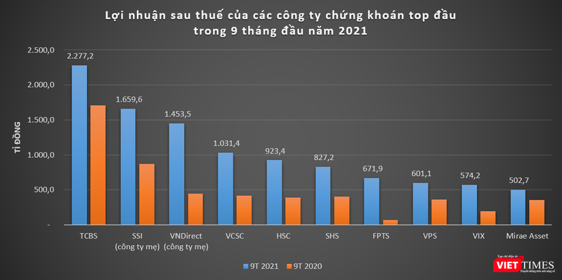 Tương tự, CTCP Chứng khoán VNDirect (Mã CK: VND) và CTCP Chứng khoán Bản Việt (VCSC - Mã CK: VCI) cũng lần lượt báo lãi sau thuế 1.453,5 tỉ đồng và 1.031,4 tỉ đồng sau 9 tháng đầu năm 2021.