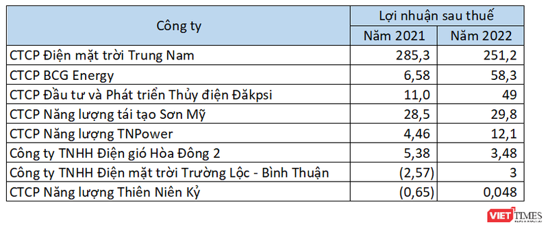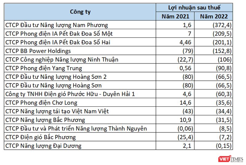 Năm 2022, CTCP Công nghiệp Năng lượng Ninh Thuận báo lỗ sau thuế 106 tỉ đồng, gấp 4,6 lần số lỗ 22,7 tỉ đồng trong năm 2021. CTCP Năng lượng tái tạo Việt Nam Việt lỗ ròng năm 2021 là 43 tỉ đồng, sang năm 2022 tiếp tục báo lỗ 34,4 tỉ đồng.