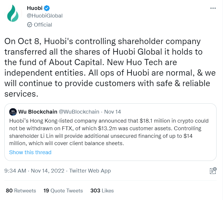 Theo thông báo, Li Lin, cổ đông kiểm soát của công ty và là nhà sáng lập Huobi, đã đồng ý cho New Huo vay 14 triệu USD để bù đắp lại thâm hụt trong bảng cân đối kế toán. Tuy nhiên, hiện vẫn chưa rõ những tác động của việc FTX phá sản đến tài chính công ty nếu mất trắng số tiền trên.