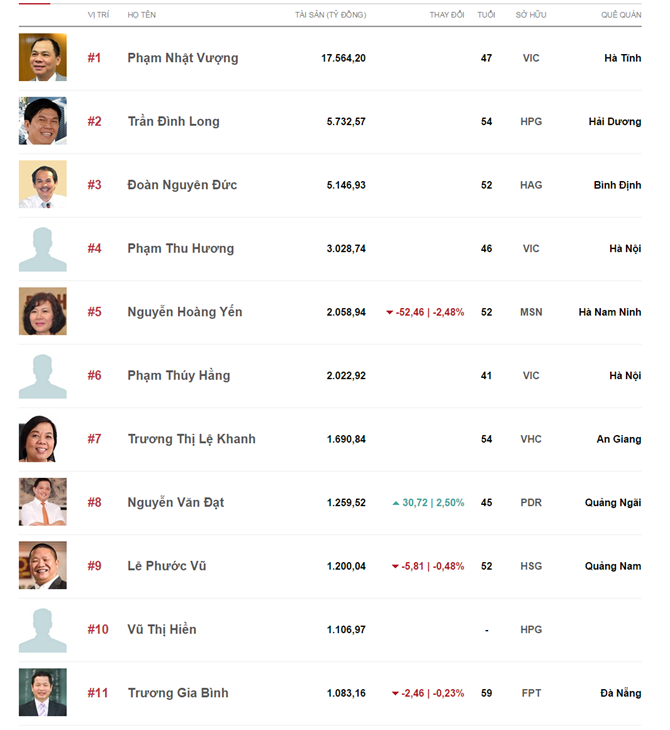 Ông Phạm Nhật Vượng cũng mất đến 850 tỷ đồng. Tuy nhiên, so với khối tài sản tỷ USD của ông Vượng thì mức giảm này chưa đến 5%.