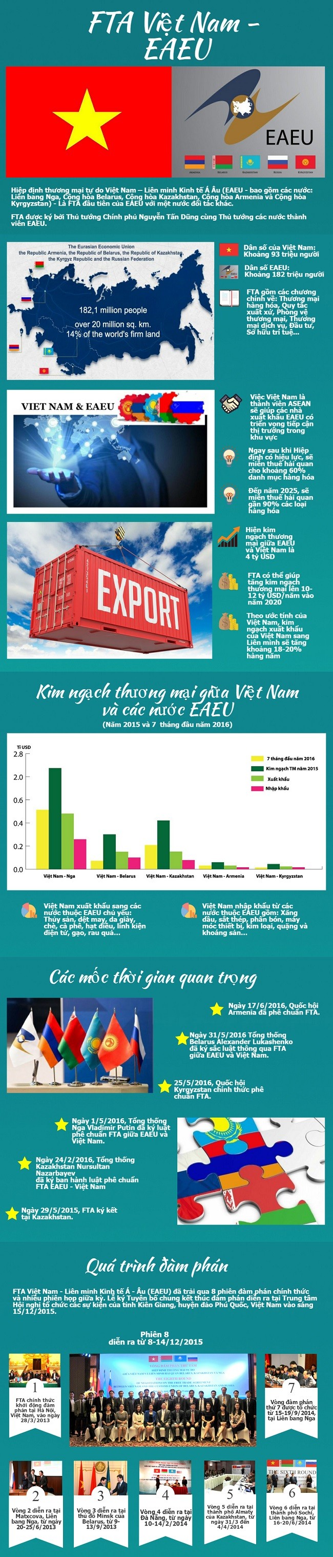 Ngày hôm qua (5/10), Hiệp định thương mại tự do Việt Nam - Liên minh Kinh tế Á-Âu (EAEU) chính thức có hiệu lực, hãy cùng nhìn lại chặng đường các bên xây dựng nên Hiệp định này.