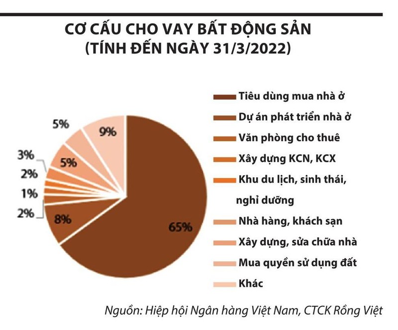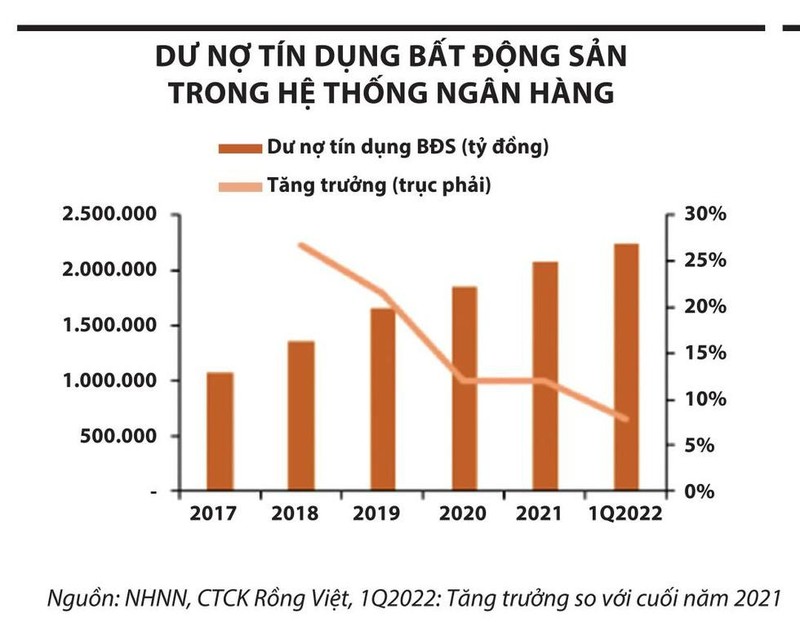 Số liệu tổng hợp từ Hiệp hội Ngân hàng Việt Nam cho biết, tốc độ tăng trưởng tín dụng bất động sản đang giảm dần, từ mức hơn 26% năm 2018 về mức 12% vào cuối năm 2021, thấp hơn tốc độ tăng trưởng tín dụng nền kinh tế. Trong quý I/2022, dư nợ đối với hoạt động kinh doanh bất động sản đạt 783.000 tỷ đồng, giảm đáng kể so với giai đoạn trước đây.