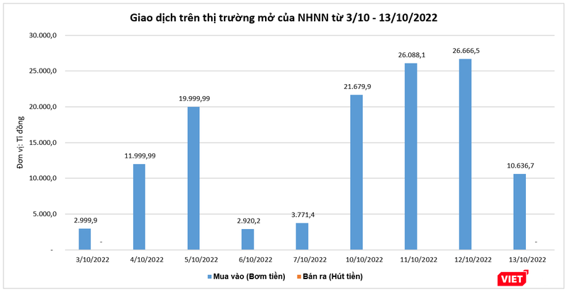 Dữ liệu từ Ngân hàng Nhà nước Việt Nam (NHNN) cho thấy, trong 9 phiên giao dịch từ 3/10 – 13/10/2022, cơ quan này đã liên tục mua vào tín phiếu từ các ngân hàng thương mại, qua đó 'bơm' ra lượng tiền tương ứng để hỗ trợ thanh khoản hệ thống.
