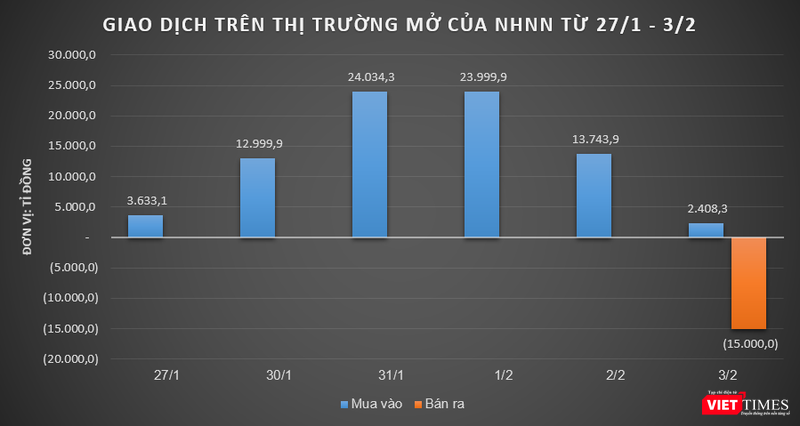 Từ ngày 27/1 – 2/2, NHNN đã thực hiện mua giấy tờ có giá kỳ hạn 7 ngày lãi suất 6%/năm, qua đó bơm ra thị trường tổng cộng 78.411,1 tỉ đồng, đồng thời tạm dừng việc hút tiền vào thông qua bán tín phiếu.