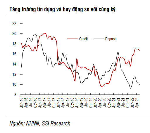 Tuy nhiên, do chênh lệch tăng trưởng tín dụng – tiền gửi hiện ở mức cao và tiền gửi từ Kho bạc Nhà nước có thể sẽ không còn dồi dào nếu đầu tư công được đẩy mạnh, SSI cho rằng trong nửa cuối năm 2022 sẽ có áp lực tăng lãi suất huy động nếu hạn mức tín dụng được nới.