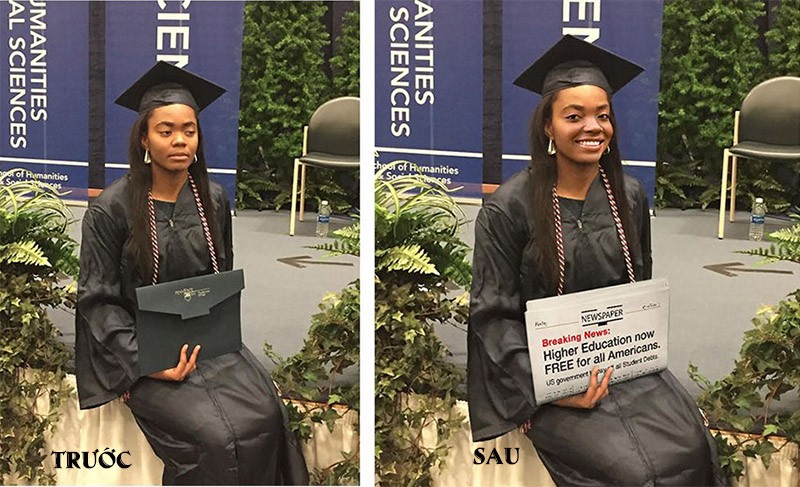 Hãy giúp tôi chỉnh ảnh để chị tôi vui vẻ sau lễ tốt nghiệp (Tờ báo có dòng chữ: Từ nay người Mỹ được học miễn phí)