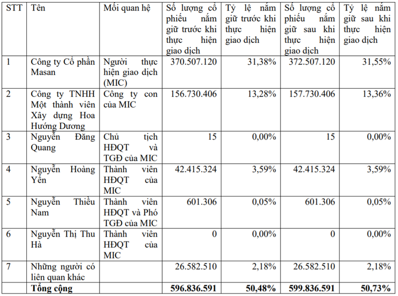 Hiện cả nhóm CTCP Masan, Công ty TNHH MTV Xây dựng Hoa Hướng Dương và các cá nhân liên quan đang sở hữu tổng cộng 596,8 triệu cổ phiếu MSN. Nếu giao dịch thành công, nhóm này sẽ nâng sở hữu lên gần 599,8 triệu cổ phiếu MSN, tương đương tỉ lệ 50,73% vốn điều lệ./.