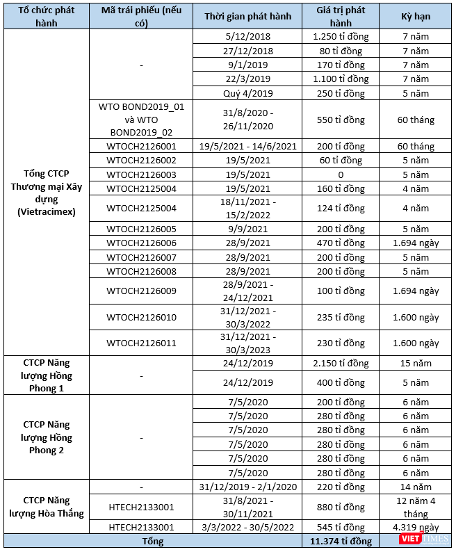 Cụ thể, từ tháng 12/2018 – 3/2022, Vietracimex phát hành tổng cộng 5.579 tỉ đồng trái phiếu, phần lớn được sử dụng để tài trợ cho các dự án năng lượng và bất động sản.