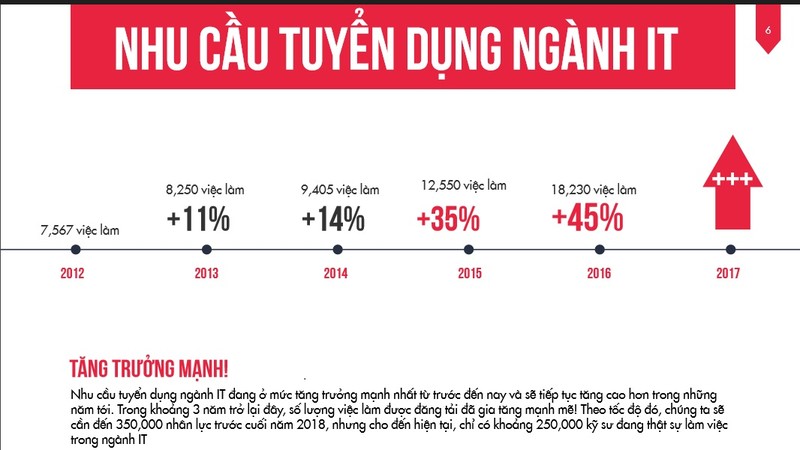 Chỉ trong vòng 4 năm trở lại đây, số lượng việc làm ngành IT gia tăng mạnh mẽ, nhu cầu tuyển dụng IT tăng dần đều qua các năm. Đặc biệt, năm 2016 tăng 45% so với cùng kỳ năm 2012, và dự báo đến năm 2018 thị trường tuyển dụng IT cần tới 350 000 lập trình viên tức tăng gấp 20 lần so với năm 2016. Trong khi đó, hiện tại chúng ta chỉ mới đáp ứng được khoảng 200 000 lập trình viên, tương đương thị trường đang thiếu khoảng 150 000 lập trình viên. Tuy nhiên nhiều chuyên gia nhận định rằng đây chỉ là sự thiếu hụt ngắn hạn.