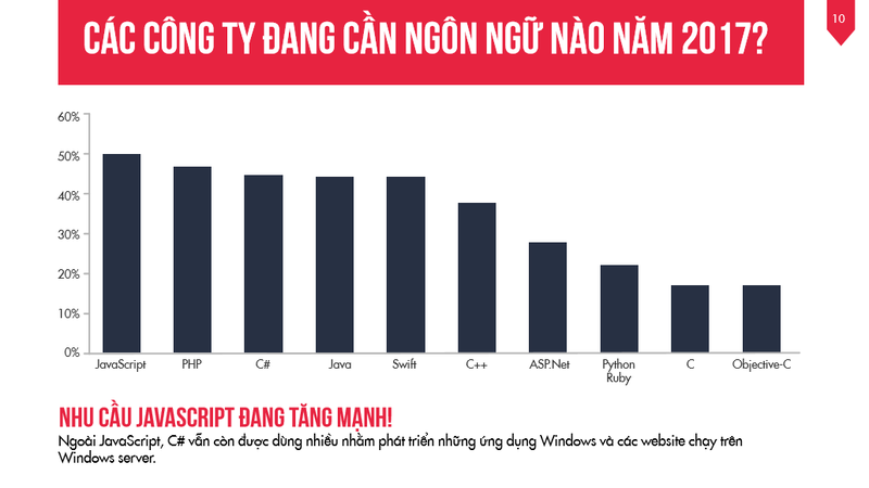 Đặc biệt đáng chú ý là nhu cầu về Javascript tăng mạnh, các nhà tuyển dụng đánh giá cao các ứng viện thông thạo Javascript và biết nắm bắt các framework hỗ trợ khác. Mặc dù Javascript còn tồn tại rất nhiều nhược điểm như không có trình biên dịch riêng, có thể làm ứng dụng web trở nên nặng nề hơn, bảo mật kém… Tuy nhiên, với những ưu điểm không thể phủ nhận là hoàn toàn miễn phí và dễ sử dụng, Javascript gần như là 1 yêu cầu không thể thiếu trong lập trình web front-end và đang tấn công sang cả back-end và nền tảng di động. Điều đó lý giải tại sao nhà tuyển dụng ngày càng “ưu ái” Javascript hơn.