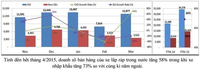 Như vậy, tổng doanh số bán hàng của toàn thị trường tính đến hết tháng 4/2015 đạt hơn 66.900 xe, tăng 62% so với cùng kì năm ngoái. Trong đó, xe ô tô du lịch tăng 60% và xe thương mại tăng 67% so với cùng kì năm ngoái.