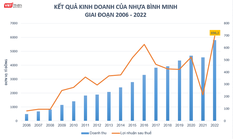 Lũy kế cả năm 2022, doanh thu thuần của Nhựa Bình Minh đạt 5.808,3 tỉ đồng, tăng 27,5% so với năm 2021. Trong khi đó, công ty báo lãi ròng năm 2022 đạt 696,2 tỉ đồng, cao gấp 3,2 lần so với cùng kỳ năm trước. Đây cũng là mức lãi kỷ lục công ty từng ghi nhận từ khi công bố báo cáo tài chính đến nay.