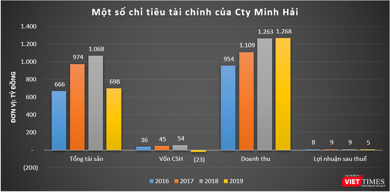 | Doanh thu đáng nể của Cty Minh Hải Theo dữ liệu của VietTimes, doanh thu của Minh Hải trong những năm gần đây liên tục các mốc nghìn tỷ, chỉ đứng sau những doanh nghiệp nhựa xây dựng tốp đầu đang niêm yết trên thị trường chứng khoán như NTP, BMP, DAG. Trong giai đoạn 2016 – 2019, doanh thu của Minh Hải liên tục cải thiện. Tuy nhiên, biên lợi nhuận lại có xu hướng giảm. Cụ thể, trong năm 2019, Minh Hải ghi nhận doanh thu và lợi nhuận sau thuế lần lượt đạt 1.268 tỷ đồng và 5,1 tỷ đồng, tương ứng với biên lợi nhuận chỉ ở mức 0,4%. Cùng với sự tăng trưởng của doanh thu, từ năm 2016 – 2018, quy mô tài sản của Minh Hải tăng mạnh từ 666 tỷ đồng lên mức 1.068 tỷ đồng. Minh Hải dường như chứng kiến biến động lớn trong hoạt động năm 2019. Bởi lẽ, quy mô tổng tài sản tính đến cuối năm ngoái của doanh nghiệp này bất ngờ sụt giảm về mức 697,5 tỷ đồng. Thậm chí, quy mô vốn chủ sở hữu của Minh Hải còn sụt giảm xuống mức âm 23,1 tỷ đồng./. |