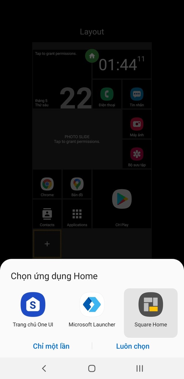 Để thay đổi giao diện mặc định trên Android, ngay sau khi cài đặt giao diện mới, bạn nhấn vào nút Home trên smartphone để quay trở lại màn hình chính. Lúc này, một hộp thoại hiện ra, cho phép người dùng lựa chọn giao diện để sử dụng. Bạn chọn tên của giao diện mới từ danh sách hiện ra, sau đó nhấn “Luôn chọn”.