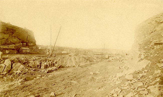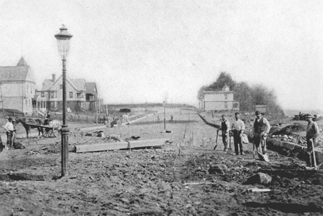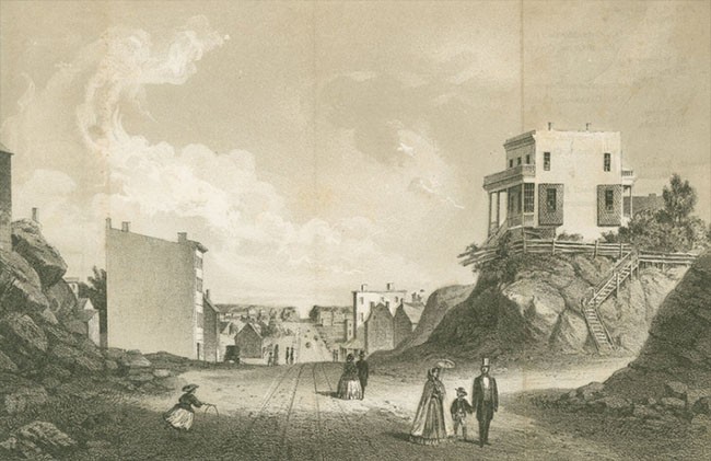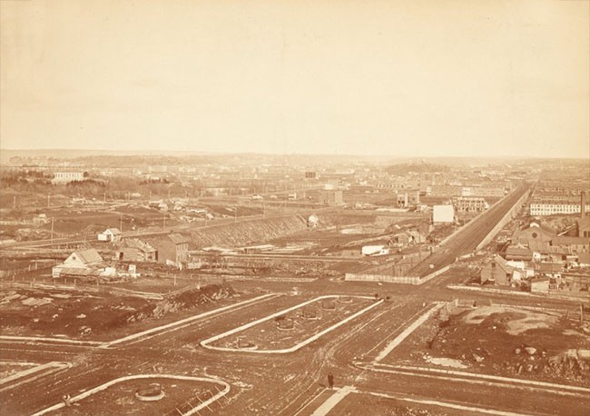 8. Bức ảnh năm 1869 này cho thấy một nhóm người lao động đang đào qua một sườn đồi để mở rộng Đại lộ thứ tám về phía bắc.