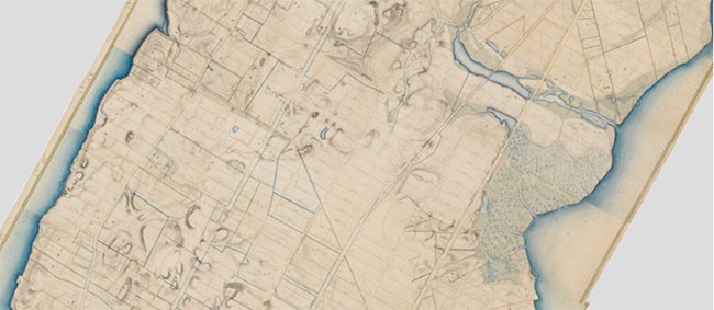 3. Giữa năm 1818 và 1820, nhà khảo sát người Mỹ John Randel Jr. đã chuẩn bị một cuốn atlat 92 bản đồ màu nước minh họa đặc điểm các trang trại và các con đường cũ (được lên kế hoạch vào năm 1811) cũng như vị trí tương lai của các con đường mới. Bảo tàng Thành phố New York đã ghép chúng lại với nhau để tạo ra một bản đồ như hình dưới.