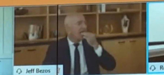 Phiên điều trần ghi nhận 90 phút vắng mặt của Jeff Bezos vì sự cố kỹ thuật. Khi hình ảnh trở lại, người xem thấy Bezos đang ăn bánh. Ảnh: Chụp màn hình.