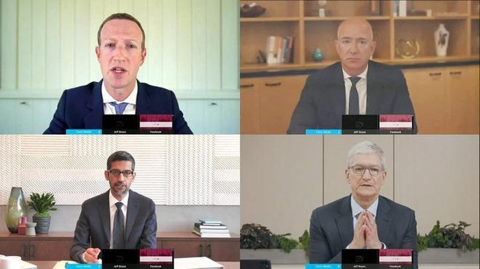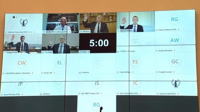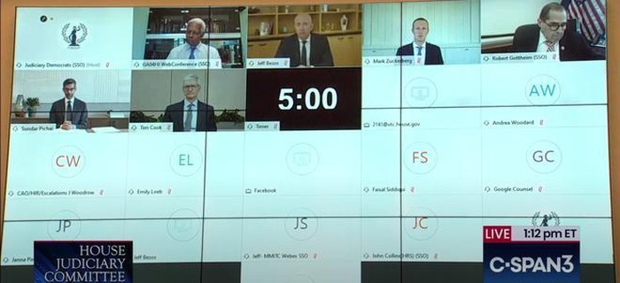 Phiên điều trần có sự góp mặt đầy đủ từ các tập đoàn công nghệ như Tim Cook (Apple), Mark Zuckerberg (Facebook), Jeff Bezos (Amazon) và Sundar Pichai (Google). Trái với sự kỳ vọng là các CEO sẽ xuất hiện tại phiên điều trần, cả 4 CEO đều lựa chọn tham gia phiên họp từ xa và mở camera liên tục để ghi hình. Ảnh: Chụp màn hình.