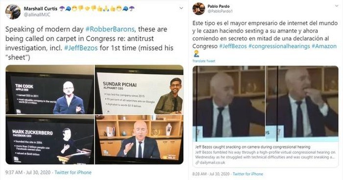 Trên mạng xã hội Twitter, nhiều người dùng ngay lập tức lên tiếng chỉ trích sự thiếu chuyên nghiệp của CEO Amazon trong lần đầu tham dự phiên điều trần như quên chuẩn bị phần giới thiệu bản thân, ăn trong lúc điều tra, không tắt tiếng âm thanh, không chuẩn bị đường truyền Internet ổn định... Ảnh: Chụp màn hình.