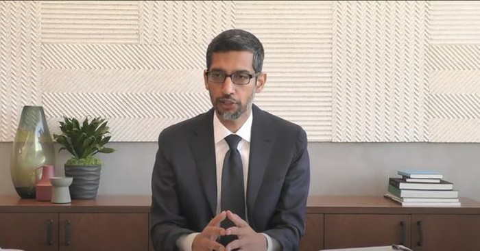 Tuy xuất hiện với hình ảnh chỉn chu, CEO Sundar Pichai của Google lại phải liên tục xin lỗi Hạ viện để nghiên cứu và trả lời sau cho các câu hỏi, gây tốn thời gian cho mọi người. Ngoài ra, ánh mắt của vị CEO này liên tục nhìn về một bên của máy ảnh như đang đọc theo ghi chú của ai đó. Ảnh: Chụp màn hình.