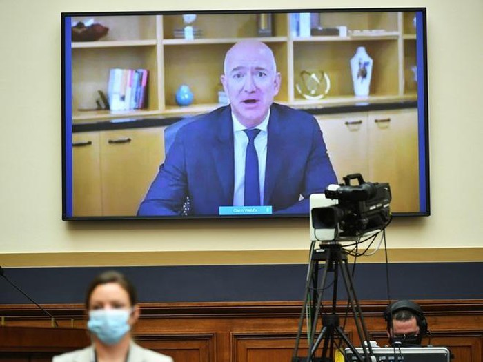 Sự chú ý nhanh chóng đổ dồn về màn hình của CEO Jeff Bezos, đây là lần đầu tiên ông phải tham dự một phiên điều trần trong suốt quá trình phát triển Amazon. Mặc dù sở hữu một trong những công ty công nghệ có sức ảnh hưởng nhất nước Mỹ, Bezos dường như không chuẩn bị một đường truyền Internet ổn định nhất. Hình ảnh video của ông liên tục mờ, âm thanh không rõ ràng, nhiều lần xảy ra mất kết nối. Ảnh: Public Broadcasting.