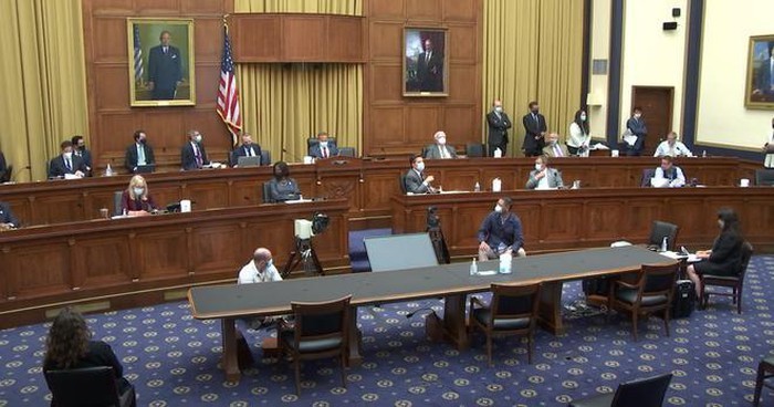 Tuy là một sự kiện quan trọng, phiên điều trần được đánh giá là tổ chức quá kém về mặt công nghệ và điều phối sau khi trễ gần 1h vì yếu tố kỹ thuật. Khi bắt đầu, chủ tịch phiên điều trần David Cicilline là người đầu tiên bị nhắc nhở đeo khẩu trang. Video livestream ghi lại âm thanh một người la lớn "Đeo khẩu trang vào ngay". Sau đó vài giây, ông Cicilline cho biết nếu người nào đang phát biểu thì có thể cởi khẩu trang để nói thuận tiện hơn. Ảnh: Chụp màn hình.