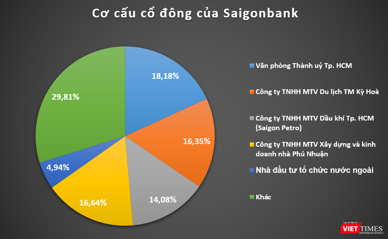 Danh sách cổ đông cũng cho thấy Saigonbank có 4 cổ đông lớn là Văn phòng Thành ủy Tp. HCM (56 triệu cổ phần, chiếm 18,18% VĐL), Công ty TNHH MTV Du lịch TM Kỳ Hòa (50,3 triệu cổ phần, chiếm 16,35% VĐL), Công ty TNHH MTV Dầu khí Tp. HCM (Saigon Petro, 43,3 triệu cổ phần, chiếm 14,08% VĐL) và Công ty TNHH MTV xây dựng và kinh doanh nhà Phú Nhuận (51,25 triệu cổ phần, chiếm 16,64% VĐL).