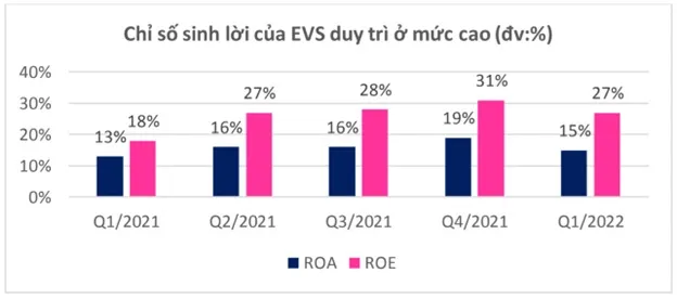 Trừ đi chi phí hoạt động, EVS báo lãi sau thuế 422,1 tỷ đồng năm 2021, tương ứng với tỷ suất sinh lời trên vốn chủ sở hữu (ROE) ở mức 25% - thuộc tốp những công ty chứng khoán có hiệu quả sử dụng vốn cao nhất.