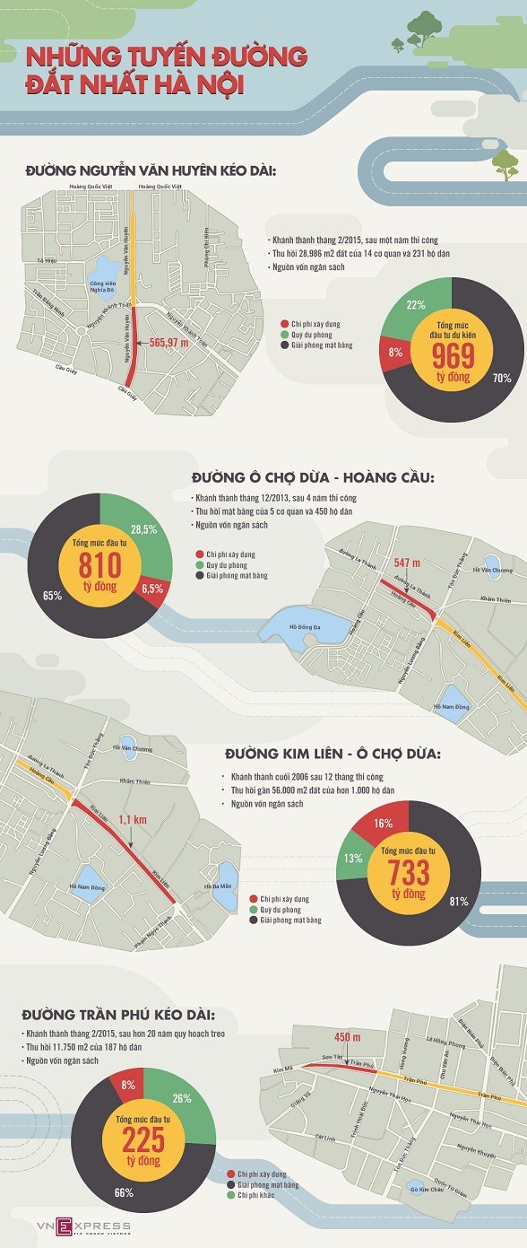 Các đoạn đường Nguyễn Văn Huyên, Trần Phú kéo dài, Ô Chợ Dừa - Hoàng Cầu và Kim Liên - Ô Chợ Dừa có tổng chiều dài khoảng 2.600 m nhưng số tiền đầu tư lên đến 2.700 tỷ đồng, do đều chạy qua những khu đất "vàng".