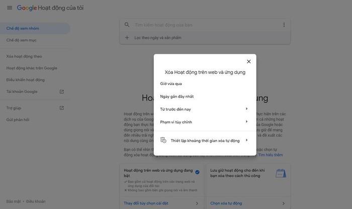Nếu muốn xóa lịch sử hoạt động thủ công, trên thanh điều hướng chọn “Xóa hoạt động theo” và chọn "Giờ vừa qua", "Ngày gần đây nhất", "Từ trước đến nay" hoặc "Phạm vi tùy chỉnh". Khi đã chọn cài đặt tự động xóa hoặc tùy chọn dữ liệu bạn muốn xóa thủ công, chọn Xóa trên cửa sổ bật lên.