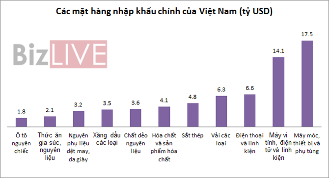 Các mặt hàng nhập khẩu chính Việt Nam trong giai đoạn này bao gồm: Ô tô nguyên chiếc; thức ăn gia súc và nguyên liệu; nguyên phụ liệu dệt may da giày; xăng dầu các loại; chất dẻo nguyên liệu; hóa chất và sản phẩm hóa chất; sắt thép; vải các loại...